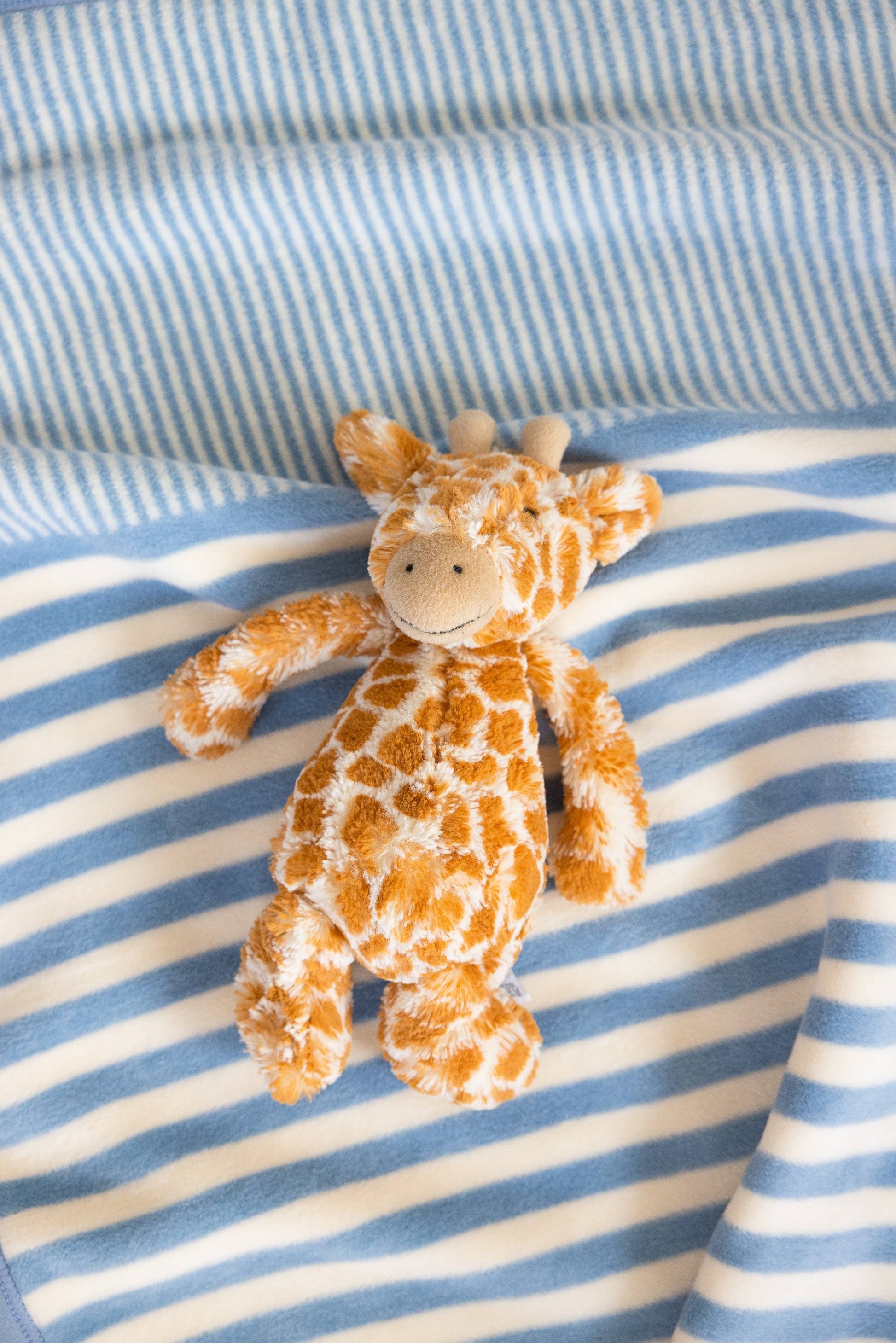 All eyes are on these baby blues. We put the softest shade of blue in an array of complementary-sized stripes—and boy oh boy, is this a sweet mini for a lucky little. Exclusively available in our mini size (30" x 40"). View blanket size guide * Mini size: 30” x 40” * Light blue & ivory * Machine wash and dry * Resistant to shrinking, pilling and fuzz * Reversible, Jacquard-woven design * Natural cotton blend: 58% cotton 35% acrylic 7% polyester *