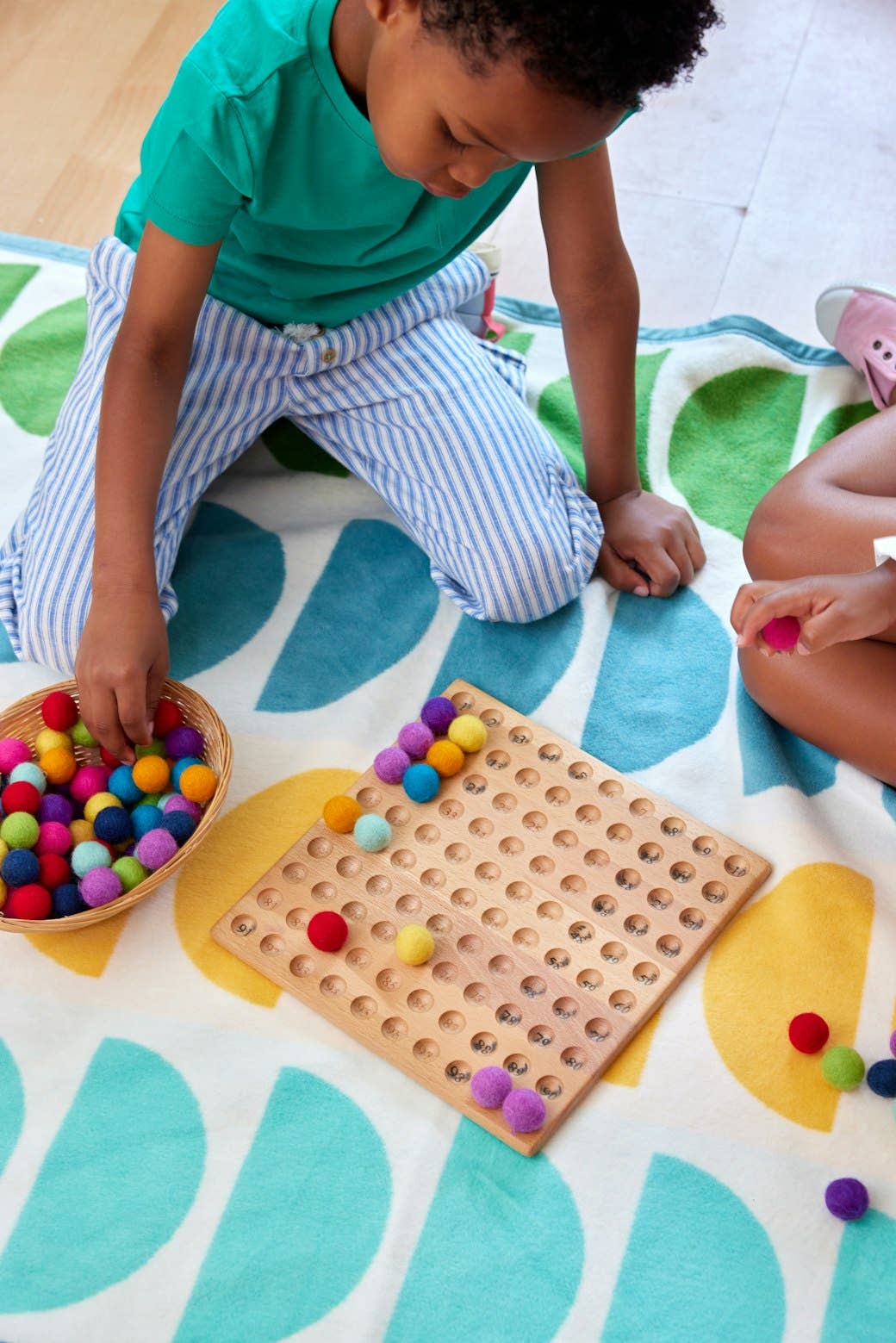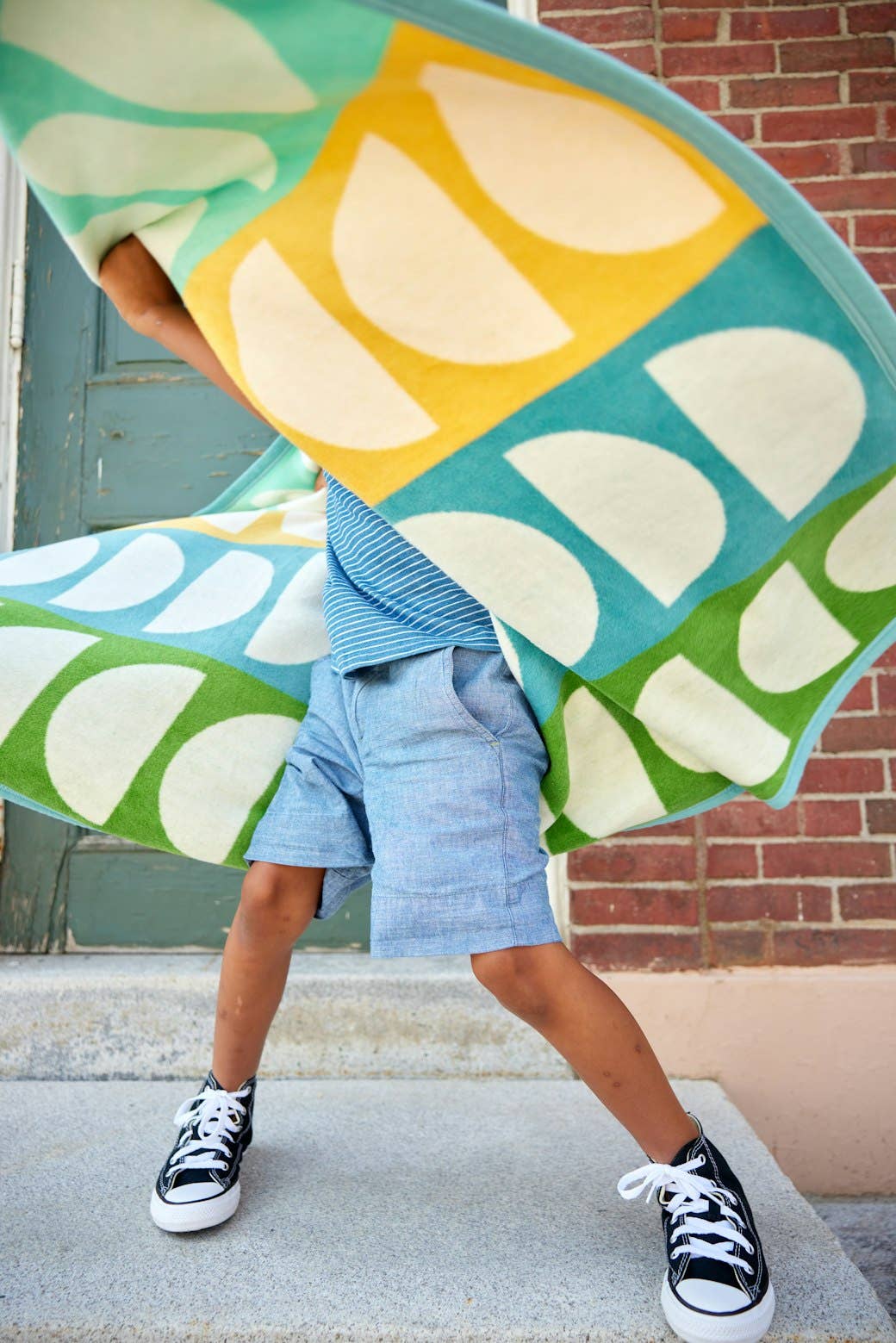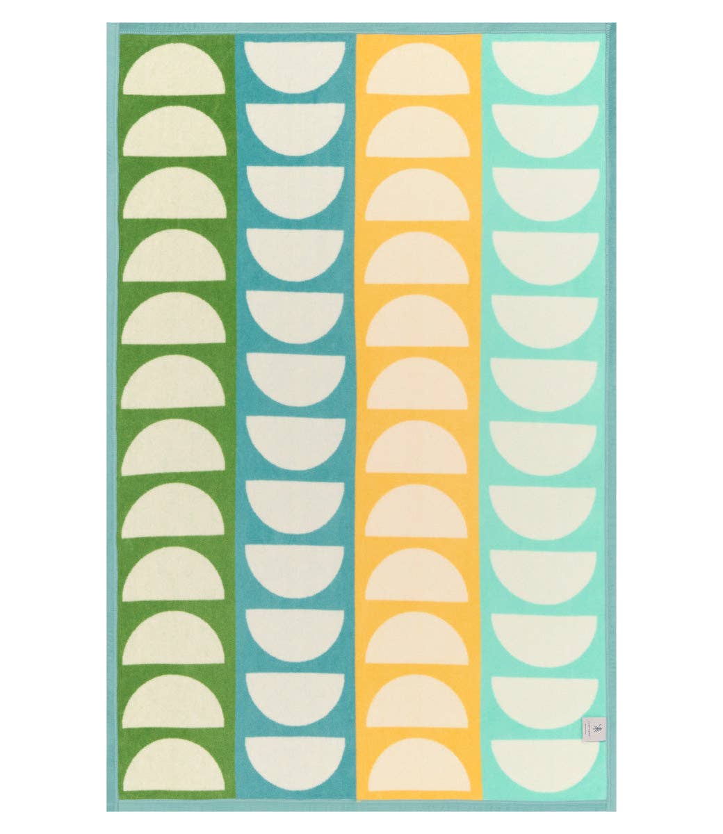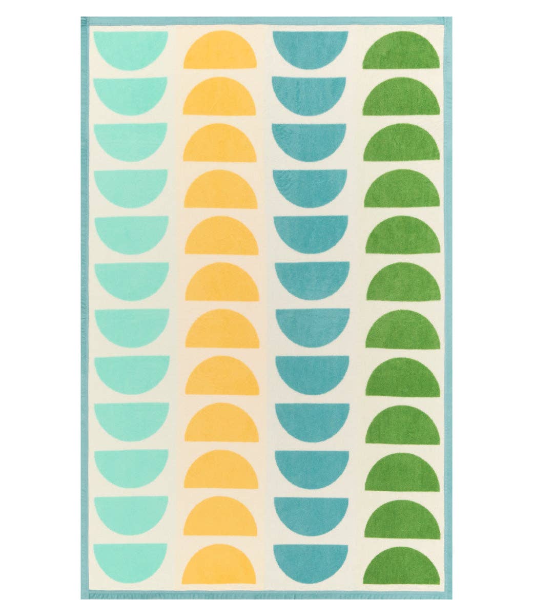 Once in a blue moon, a constellation-inspired shape becomes a geometric icon itself—like the half-moon, featured here in a medley of playful colors. 40" x 60"
