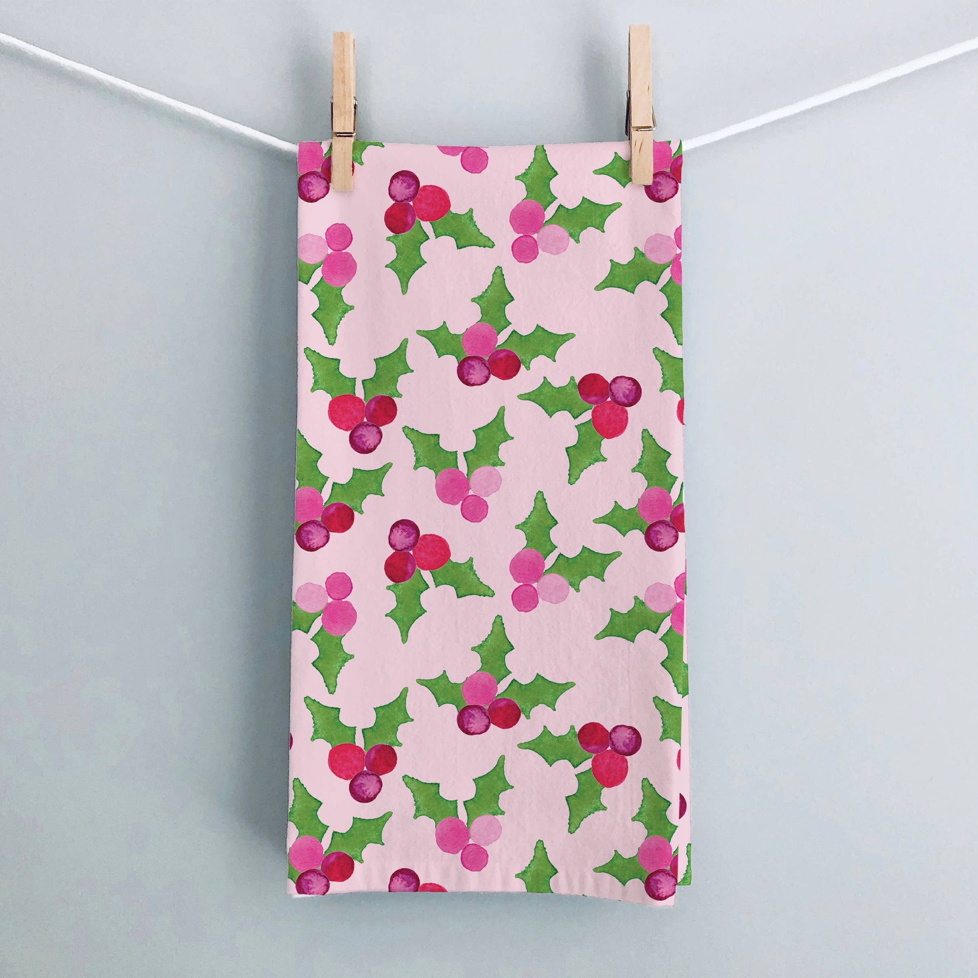 Pink Holly Tea Towel | Pink Christmas Holly Dish Towel